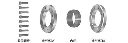 SL系列的錐形環A、B的內徑面及內環的外徑面為錐形面,通過擰緊緊固螺栓,使錐形環A、B在錐形面上滑動。